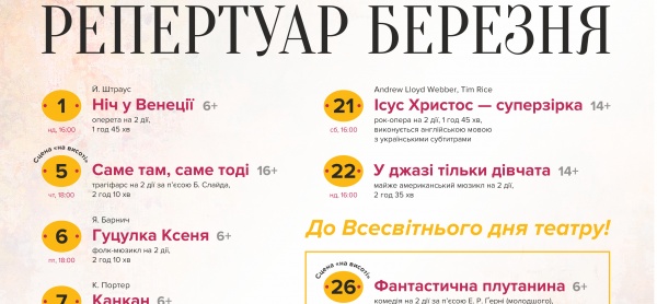Приглашаем с 1 марта на истории о любви, надежде и красоте, вере, силе и жизни. Вас ждут зажигательные оперетты, необычные представления на малой сцене, яркие мюзиклы, легендарные рок-оперы, назидательные сказки для детей.